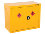 Supplied with 1 spill retaining galvanised shelf, liquid-tight sump to contain spillages, flush handles with two-point locking, reinforced doors, powder coated paint finish and relevant warning signs.