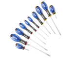 10 Piece BRIE160905B Screwdriver Set with bi-material, ergonomic handles. In addition, they have a round chrome plated blade in chrome vanadium steel each with a sand blasted tip. Contains: