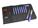Contains pockets for various sized chisels and small tools and a zip-up compartment for storing small tools or paperwork. Three elastic loops are provided for secure pen or pencil storage.