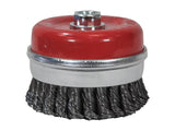 Faithfull Twist Knot Wire Cup Brush for heavier duty applications such as the removal of slag, rust, scale or even dried concrete. Designed for use with a compatible thread angle grinder.
