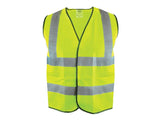 Scan High-Visibility Yellow Waistcoat with panels that reflect light to maximise visibility, particularly during the hours of darkness. Made from 100% polyester with retro-reflecting tape that absorbs and reflects light and is finished with black bound edging. Hook and loop strip for front fastening.
