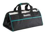 The Makita Wide Mouth Tool Bag is made from thick woven nylon material with a wide mouth for easy tool selection. It has a hi-vis strip on both sides and a padded base for rigidity and protection.