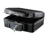 The Master Lock H0100 Small Key Locking Chest is waterproof and fire-resistant. It has a sleek design with a flush mounted faceplate and rugged look.