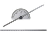 The Moore & Wright Protractor Type Depth Gauge has a full range rule adjustment and the readings can be fixed by means of a locknut. Rules are graduated on both sides.