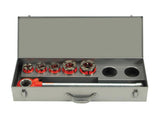 The set comes complete with a ratchet handle, dies, die heads, and metal case.