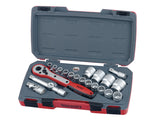 This TENT1221 1/2inch drive 12-point socket set comprises 21 pieces, which are supplied in a plastic case with a latch lock, retractable handle and metal pin hinges. The underside of the case is fitted with rubber feet to prevent it from sliding.