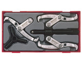 This Teng Tools TT804 set consists of a 3-legged combination puller with an extra yoke for switching to two legged pulling. The puller's legs are reversible for internal and external grip. For strength, it is manufactured from chrome vanadium steel. It is ideal for fast removal of pulleys, wheels and bearings.
