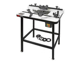The Trend WRT Workshop Router Table has a steel leg frame with adjustable feet, a large, laminated MDF table and a quick-release aluminium extrusion back fence with sliding MDF cheeks. Its removable 6.35mm thick aluminium insert plate has a 98mm diameter aperture pre-drilled for Trend TBC routers, T11 and T14 routers. There is also a quick raiser and quick-release facility for the Trend T11 and T14 routers.