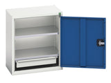 This Bott Verso Economy Cupboard is made from durable steel housing and finished in durable powder coat paint (RAL 7035 light grey and RAL 5010 gentian blue). It has 2 adjustable height, galvanised steel shelves (35kg U.D.L.) and 1 x 75mm drawer (10kg U.D.L.).