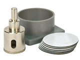 This system uses self-adhesive pads for secure positioning and provides the necessary lubrication to extend the life of the drill and cool the drilling surface, includes water delivery and collection cups for clean drilling.