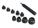 Kits comprise of a single wad punch handle onto which screws a series of nine interchangeable punches. The handles are blackened and punches heat treated and chemically blacked. The handle should be struck with a hammer or mallet onto a wooden block. The spring loaded plunger in the handle enables holes to be accurately centred and serves to eject the slug.